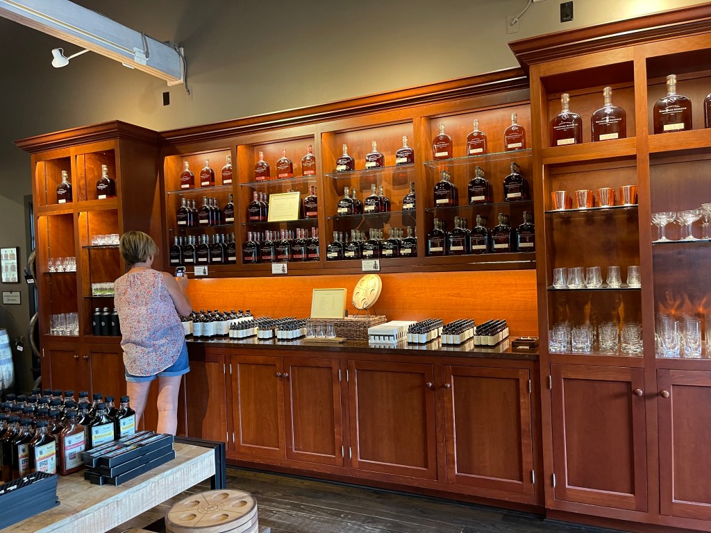 Traveling home from Richmond KY we chose to freestyle and took the north route to Lexington via Interstate 75 toward Louisville then got irritated at the decision from shitty construction everywhere, then…bam-a sign for “WOODFORD RESERVE”…the American bourbon maker most people here in the states who are connoisseurs of spirits certainly know about. FanTASTIC lets go. So we wound our way through the countries grandest equestrian estates, along a 2 lane route that was full of sprawling rollling pastures and horses…horses everywhere. Everything shifted to excitement – something new to see, new dirt, new lands it was ALL KENTUCKY…another freestyle adventure turning up gold. Arriving at last 30 minutes before opening at noon (Sunday) we decided to free range along the tight winding road, taking in the sites and rolling geography dotted w barns and some of the longest and oldest looking antebellum era “slave walls” which were likely built by entire multi generational African American families, or enslaved laborers, working for their “masters” who were likely wealthy horse breeders and perhaps whiskey men. Oh the bones..Noon hour hit we turned back, drove through the gate and to our wonderful surprise this amazingly country chic but rustic and well appointed distillery was absolutely gorgeous and blooming out in blossoming white full hydrangeas with crêpe myrtles and foliage staged to perfection for the surrounding environment. Even the the large stone pathway with its perfectly queued mortar pulled me in and directed me up into the house you enter through large beautiful double glass doors with sturdy pulls. We walked into the gift shop and I was I was blown away at the gorgeousness of the modern feel grounded in stone glass steel with a perfectly tailored touch of fire running in the fireplace that set the backdrop for the show room with real style. We took time to look at the interesting swag, perused all the tchotchkes and was amazingly surprised at a gorgeous culinary section of syrups bitters oils all made from concoctions that had something to do with their bourbon. Though we did not have time to take the long tour of the actual working building where the action and history takes place, we bought a few things and then we left there totally satisfied. Then…as the freestyle road Gods of luck would have it ..on the way to leave for home I overhear a woman say “Buffalo Trace you can walk all around…“ Ohhhh really? google…”How far is Buffalo Trace Distillery” …11 miles away…we were off…little did we know we were on the Kentucky Bourbon Trail…